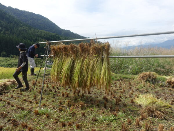 今回の作業は鎌で稲を刈り、8~10株ずつ稲穂でまとめました。まとめた束ははぜに掛け、乾燥させます。